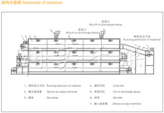 物料由加料器均勻地鋪在網帶上,網帶采用12-60目不銹鋼絲網。由傳動裝置拖動在干燥機內移動。干燥機由若干單元組成,每一單元熱風獨立循環,部分尾氣由專門排濕風機排出,廢氣由調節閥控制,熱氣由下往上或由上往下穿過鋪在網帶上的物料,加熱干燥并帶走水分。網帶緩慢移動,運行速度可根據物料溫度自由調節,干燥后的成品連續落入收料器中。上下循環單元根據用戶需要可靈活配備,單元數量可根據需要選取。